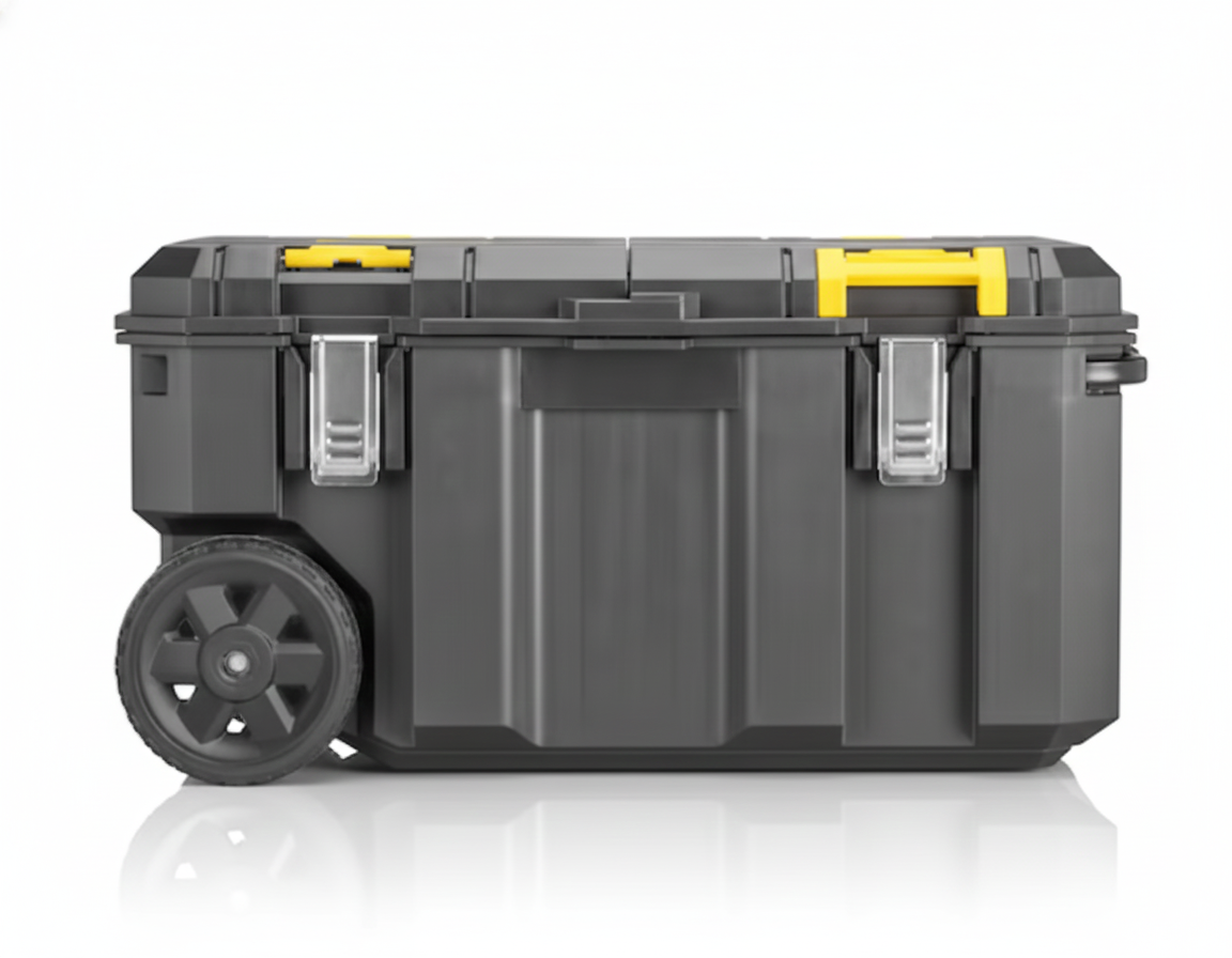 Equipada com rodas integradas, facilita o transporte de cargas pesadas, suportando até 50 kg e oferecendo um volume interno de 113 litros, ideal para ferramentas elétricas, manuais e acessórios diversos.