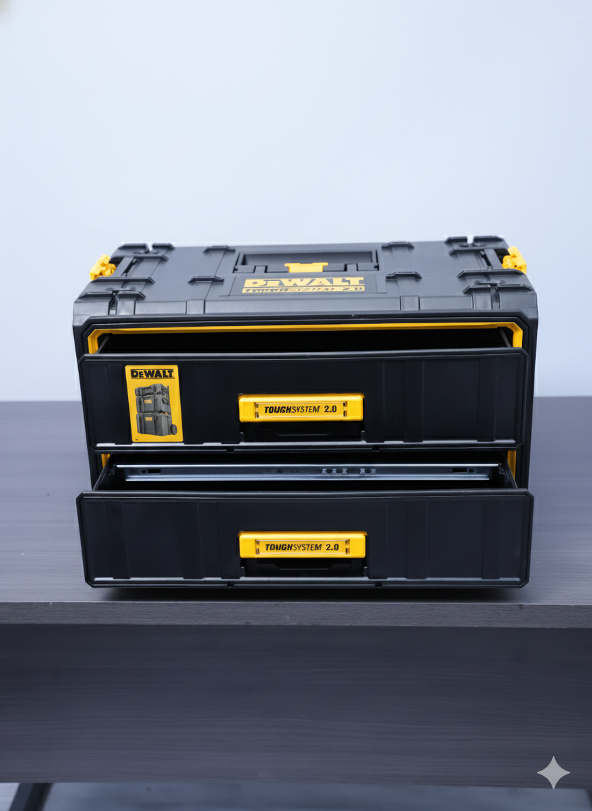 A Caixa Tipo Gaveta Dupla ToughSystem® 2.0 Dewalt foi projetada para profissionais que necessitam de armazenamento robusto, organizado e de fácil acesso no dia a dia. Com gavetas duplas espaçosas, ela oferece excelente capacidade para armazenar ferramentas, acessórios e componentes, suportando até 10 kg de carga.