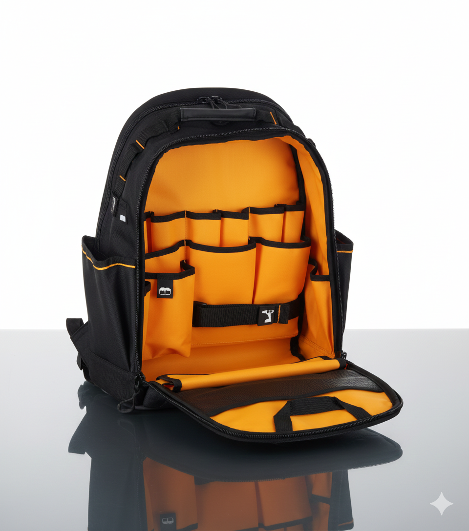 Conta com 43 bolsos estrategicamente distribuídos, incluindo compartimentos dedicados para furadeira, baterias, ferramentas manuais e ferramentas longas, proporcionando organização eficiente no dia a dia. O compartimento resistente à água com classificação IP54, aliado à base totalmente impermeável, ajuda a proteger ferramentas, objetos de valor e equipamentos eletrônicos.