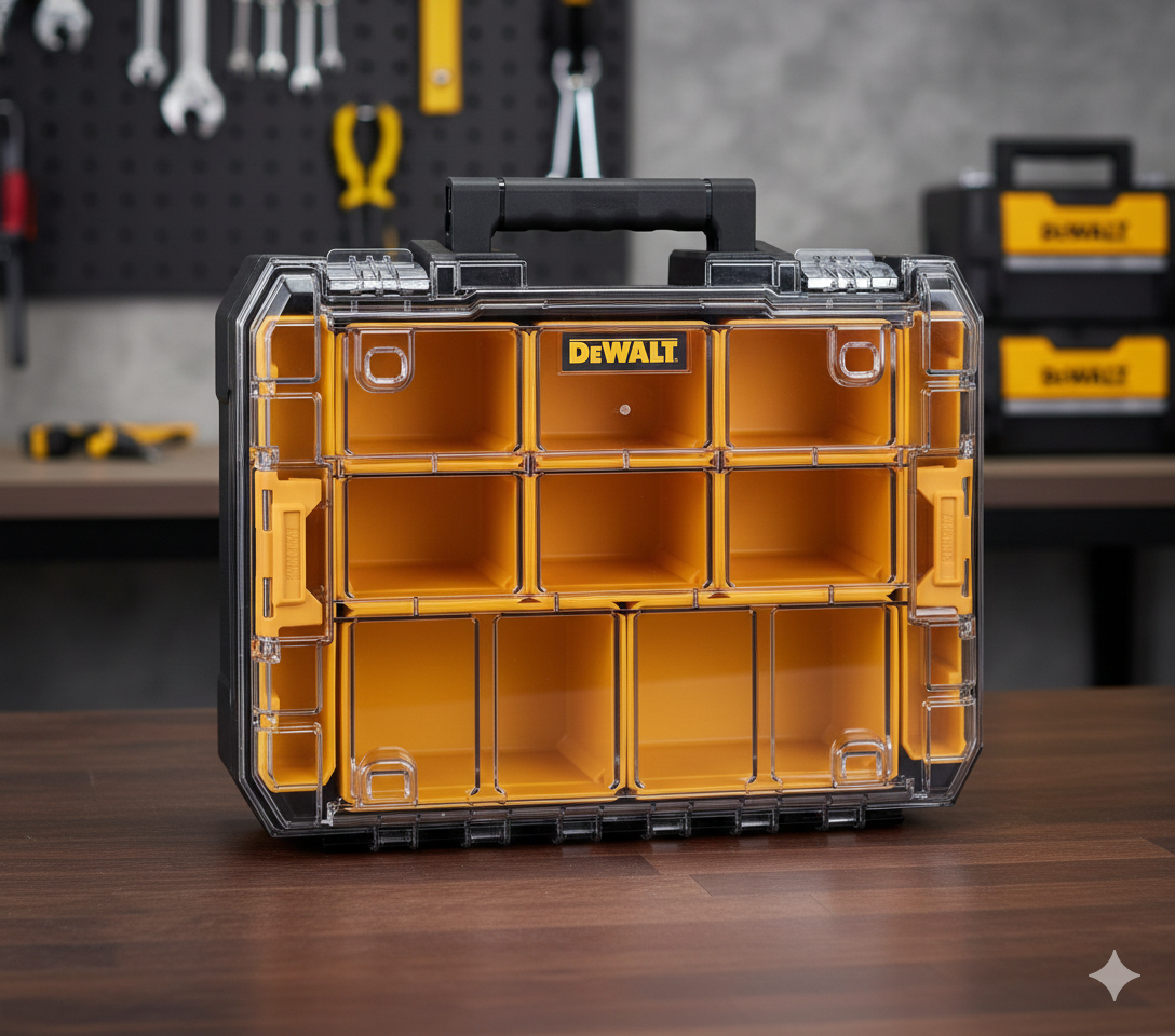 Conta com organizador superior com divisórias fixas, ideal para armazenar brocas, bits e pequenos componentes, mantendo tudo acessível e bem organizado. As travas metálicas resistentes à ferrugem garantem maior segurança e durabilidade, mesmo em ambientes de uso intenso.